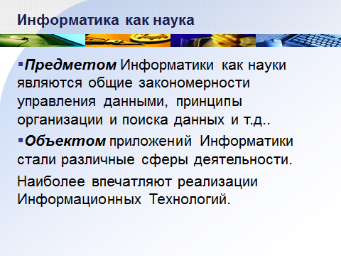 Предметом Информатики как науки являются общие закономерности управления данными, принципы организации и поиска данных и т.д.. Объектом приложений И. стали различные сферы деятельности. Наиболее впечатляющие реализации ИТ, используют ставшие традиционными сокращения: