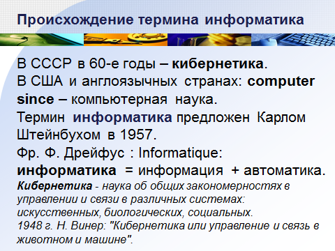 Информация (определение 1 с точки зрения кибернетики ) - любая совокупность сигналов, воспринимаемая из внешней среды, выдаваемая во внешнюю среду, хранящаяся в себе. После 2 мировой войны возникла и начала бурно развиваться кибернетика как наука об общих закономерностях в управлении и связи в различных системах: искусственных, биологических, социальных. В 1948 г амер. матем. Норберт Винер: "Кибернетика или управление и связь в животном и машине". Вскоре вслед за появлением термина "К" в мировой науке стали использовать "computer science" в англ. В 60-70 -е французы ввели термин "Informatique". Ранее под И. понималась узкая область, изучающая структуру и общие свойства научной информации, изучаемой посредством научной литературы.