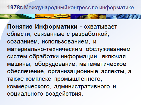 В 1978 г Международный конгресс по информатике определил: Понятие «Информатика» охватывает области, связанные с разработкой, созданием, использованием и материально-техническим обслуживанием систем обработки информации, включая машины, оборудование, математическое обеспечение, организационные аспекты, а также комплекс промышленного, коммерческого, административного и социального воздействия.