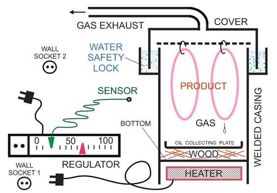 Рисунок 1 – Схема лабораторного стенда Коптильная установка содержит терморегулятор с датчиком температуры для того, чтобы нагреватель включался при недостаточной температуре продукта. Датчик помещаем в продукт. Вилку от нагревателя (электроплитки), включаем в розетку, имеющуюся на регуляторе. Вилку терморегулятора включаем в настенную розетку. Такое подключение автоматики, казалось бы логичное, приводит к неожиданному плохому результату. Куры ещё не успевают как следует прогреться, а нагреватель уже раскаливается! Оказывается, пока продукт медленно нагревается, плитка успевает перегреться. В такой коптильне плитка может быстро перегореть. Вывод: коптильня работает неправильно. Необходимо заняться исследованием динамики процесса. Схема потоков энергии показана на рисунке 2: электрическая энергия подаётся на плитку, плитка подогревает воздух, воздух разогревает продукт.