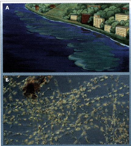 Рис. 8.15. Эвтрофирование в прибрежной полосе Северного моря: А - вид сверху; Б – капля воды под микроскопом Серьезные нарушения вызывает интенсивное зарастание прибрежных мелководий высшей водной растительностью. Зарастания затрудняют заборы воды и рыбный промысел, воздействуют на динамику вод: уменьшают скорость береговых течений, гасят волновые движения, увеличивают седиментацию, нарушают водообмен. Остатки отмерших водорослей на мелководьях могут вызывать процессы гниения и брожения, сопровождающиеся выделением дурнопахнущих продуктов. В случае рекреационного использования водоемов к отрицательным последствиям цветения и зарастания следует добавить снижение эстетических достоинств ландшафтов. При разложении водорослей в воде увеличивается концентрация свободной углекислоты, аммиака, сероводорода, восстановленных соединений железа, марганца и других веществ. Это приводит к резкому ухудшению качества питьевой воды, иногда делает ее токсичной. В водопроводной сети выпадает осадок гидрооксида железа. Увеличивается агрессивность воды относительно бетона, разрушаются материалы, применяемые в гидростроительстве. Ресурсная деградация водоемов ставит проблему антропогенного эвтрофирования в ряд глобальных. Причины антропогенного эвтрофирования - избыточное поступление в водоемы биогенных веществ. Основными питательными для водорослей (биогенными) веществами являются минеральные формы углерода, азота и фосфора. Содержание углерода в воде в форме углекислоты, дикарбонатов и органических веществ практически всегда достаточно; лимитируют или стимулируют развитие водорослей обычно соединения фосфора и азота. Связь эвтрофирования водоемов с обогащением их фосфором и азотом не нуждается в специальных доказательствах и вытекает из схемы балансового уравнения фотосинтеза: Qсолн 106СО2+90Н2О+16NО3+РО43- D С106Н180О46N16Р+154О2+Qтепл. Согласно закону действующих масс при увеличении концентрации азота и фосфора скорость прямой реакции, т.е. скорость фотосинтеза, возрастает, что и приводит к эвтрофированию. Это положение подтверждено многочисленными исследованиями на водоемах. Например, эвтрофирование Боденского озера в начале 60-х гг. было связано с увеличением в воде концентрации фосфатов: в 1940 г. фосфатный ион не обнаруживался, в 1950 г. было найдено 4,5 мг/м3, в 1955 г. - 12, в 1960 г. - 30, а в 1964 г. - уже 50 мг/м3. То же наблюдалось в Цюрихском озере, где содержание минерального фосфора возросло с 69 мг/м3 в 1946 г. до 269 мг/м3 в 1969 г., что привело к появлению очевидных признаков эвтрофикации. В озере Вашингтон до начала эвтрофирования в 1933 г. содержание фосфатов было 10 мг/м3, а нитратов - 100 мг/м3; в 1963-1965 гг. концентрации этих ионов соответственно возросли до 60 и 500 мг/м3, и в озере началось цветение. В Невской губе и Финском заливе признаки увеличения степени трофности наблюдаются в тех районах, где концентрации фосфат-ионов превышают 20-30 мг/м3. Имеет значение и соотношение основных питательных элементов, используемых водорослями. Считается, что максимальная скорость роста достигается в воде, в которой соотношение углерода, азота и фосфора (С:N:Р) соответствует их атомно-массовому отношению в составе вещества водорослей. Для фитопланктона в среднем оно приближается к 106:16:1. Всякое отклонение от данного соотношения в окружающей среде говорит об изменении