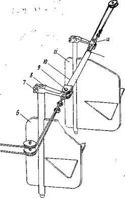 •Рис. 122. Схема привода управления рулями: 7 — штурвальное устройство; 2 — приводная цепь; 3 — направляющие ролики; 4 — тросы; 5 — стяжная муфта; 6, 11 — левый и правый рулн поворота; 7 — стяжной болт; 8 — рычаг; 9 — палец; 10 — поперечная тяга; 12 — вилка