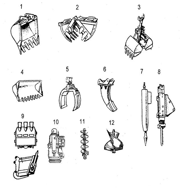 Рис. 2.20. Землеройное оборудование одноковшовых экскаваторов: 1 – ковш прямой и обратной лопаты; 2 – грейфер; 3 – напорный грейфер; 4 – планировочный ковш; 5 – клещевой захват; 6 – зуб-рыхлитель; 7 – гидромолот; 8 – электромолот; 9 – ковш с активными зубьями; 10 – гидротрамбовка; 11 – бур-шнек; 12 – лопастной бур
