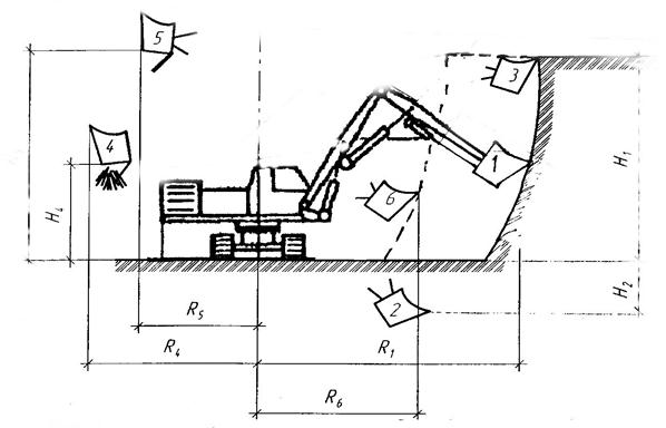 Рис. 2.22. Основные технологические параметры экскаватора: R1 – максимальный радиус резания; H 2 – максимальная глубина резания; H1 – максимальная высота резания; R 4 – максимальный радиус выгрузки; H4 – высота выгрузки при R 4 ; H 5 – максимальная высота выгрузки; R 5 – радиус выгрузки при H 5 ; R 6 – минимальный радиус резания