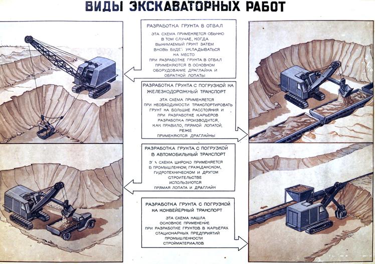 Эффективные области применения ковшей следующие: - прямая лопата – разработка сухих грунтов выше уровня стоянки с погрузкой в транспорт; - обратная лопата – разработка сухих и влажных грунтов ниже уровня стоянки с отсыпкой в отвал; - драглайн – разработка влажных и мокрых грунтов значительно ниже уровня стоянки (глубоких выемок) с отсыпкой в отвал. Драглайн имеет легкую длинную решетчатую стрелу и ковш на гибкой подвеске, что обусловливает большой радиус работы (резания и погрузки) и большую высоту погрузки и глубину черпания; - грейфер – разработка слабых грунтов (песок), разрыхленных, мокрых, в т.ч. под водой, грунтов ниже уровня стоянки (глубокие выемки) с отсыпкой в отвал; - напорный грейфер – разработка грунтов I-III групп; устройство глубоких узких траншей (технология «стена в грунте»); - планировочный ковш – при планировке под заданную отметку; при небольшой площади планировки; планировка откосов насыпей и выемок, дна траншей.