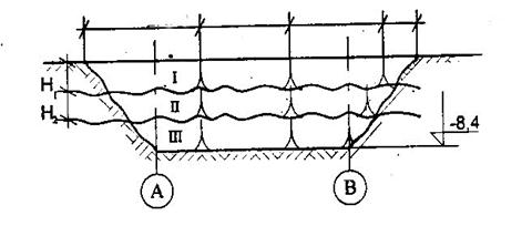 Рис. 2.23. Схема ярусов и проходок экскаватора: I., II, III – номера ярусов; H 1, H 2 – высота яруса Участок работы забой – место постановки экскаватора и самосвалов, части разработанного грунта (рис. 2.24). При небольших объемах котлована отсыпка грунта ведется в отвал (на вымет) на некотором расстоянии от края котлована (берма) для прохода рабочих. В большинстве случаев отсыпка (погрузка) ведется в автосамосвалы.