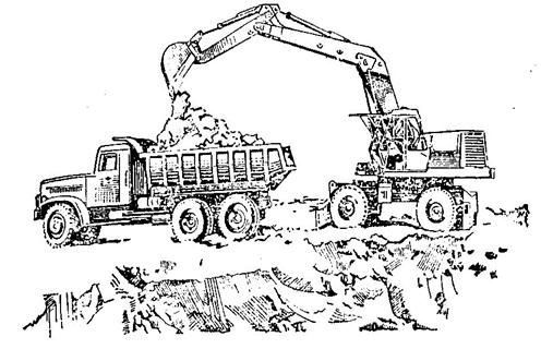 Рис. 2.27. Гидравлический экскаватор обратная лопата на пневмоколесном ходу ЭО-4321 с емкостью ковша 0,8 м3; самосвал КРАЗ-25751 с объемом кузова 6,0 м3