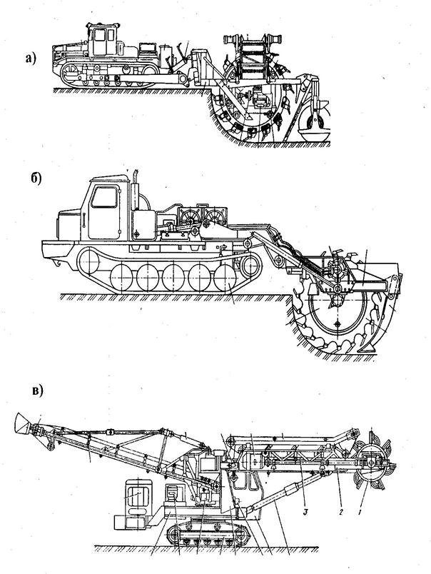 Рис. 2.29. Многоковшовые экскаваторы цепные: а – ЭТЦ-252; б – экскаватор поперечного копания ЭПЦ-143; в – ЭТЦ-250
