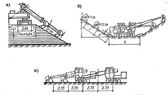 Возможность разработки котлована тем или иным типом проходки зависит от ширины и глубины котлована и параметров экскаватора и самосвалов, при этом технику располагают на дне котлована или на поверхности земли (на верху) (рис. 2.25, 2.26). Котлованы шириной до 1,5R (рис. 2.25, а) разрабатывают лобовой проходкой с односторонней погрузкой, при ширине (1,5 - 1,9)R возможна двухсторонняя подача самосвалов, т.к. при этой проходке они подаются по одному задним ходом (тупиковая подача) (рис. 2.25, б). Котлованы шириной до (1,9 - 2,5)R разрабатываются уширенной лобовой проходкой с зигзагообразным перемещением экскаватора в забое (рис. 2.25, в), при ширине до 3,5R - с поперечным его перемещением (рис. 2.25, г). В обоих случаях уширенная лобовая проходка должна обеспечивать разворот самосвалов в забое, поэтому в забое одновременно находятся два самосвала: один под погрузкой, другой наготове. Такая технология обеспечивает бесперебойную работу экскаватора как ведущего механизма процесса.