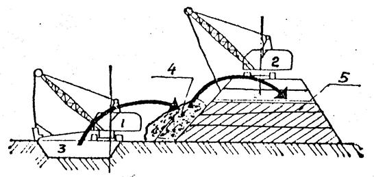 Рис. 2.32. Возведение насыпей экскаватором: 1, 2 – экскаваторы; 3 – резерв; 4 – отвал грунта (кавальер); 5 - насыпь