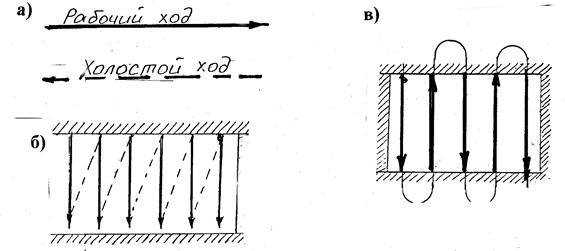 Рис. 2.45. Схемы работы бульдозера: а – челночная; б – челночная со смещением; в – зигзагообразная