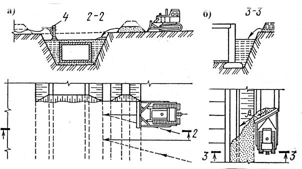 Рис. 2.49. Выполнение обратных засыпок бульдозером: а – в траншеи поперечными и косопоперечными проходками; б – в пазухи траншеи подземного коллектора по челночной схеме