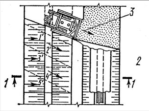 Рис. 2.50. Выполнение обратных засыпок движением бульдозера с наклонным отвалом: 1 – отвал грунта для засыпки траншеи; 2 – засыпка грунта вручную; 3 – направление движения бульдозера 1 /; 2 /; …. 5 /