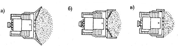 Рис. 2.43. Схема работы бульдозера: а – зарезание грунта; б – транспорт; в – отсыпка 4.2. Техника: бульдозеры. Их различают по базе: гусеничные - имеют большое тяговое усилие; колесные - более мобильны и не требуют специального транспорта для доставки на объект. Основными технологическими параметрами бульдозера являются размеры ножа (отвала), определяющие его производительность. Нож может быть закреплен жестко – неуправляемый, возможно наличие системы управления ножом (поворота на некоторый угол) в горизонтальной и вертикальной плоскости (рис. 2.44).