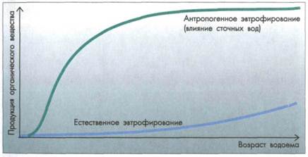 ют тяжелые компоненты нефти, которые оседают на дно океана. Они вызывают гибель донных организмов: крабов, устриц, мидий и других моллюсков. Нефтяное загрязнение придает запахи и привкусы рыбам и промысловым морским организмам, что делает их непригодными для употребления человеком. Большинство форм морской жизни восстанавливается после воздействия на них сырой нефти в течение трех лет. Восстановление жизни после воздействия очищенной нефти, особенно в эстуариях, может продолжаться десятки и более лет. Нефтяные пятна в холодных полярных водах сохраняются дольше. Нефть, которая выносится на берег, наносит серьезный экономический ущерб жителям прибрежных районов: падает доход от рыбной ловли, туризма, зон рекреации, пляжей. В Антропогенное эвтрофирование - одно из проявлений воздействий человека на водные экосистемы. В конце XX столетия эта проблема приобрела особую актуальность во всем мире. Эвтрофирование (гр. ей - избыточный, trophe - пища) может приводить к деградации как пресноводных, так и морских экосистем, вызывает вторичное загрязнение воды и нарушает все виды водопользования. Трофность водоемов - термин, введенный в 1921 г. немецкими гидробиологами А. Тинеманом и Э. Науманом для обозначения способности водоемов фотосинтезировать органическое вещество как пищу для рыб. Впоследствии этим термином стали пользоваться для обобщенной характеристики и классификации водных экосистем. Выделяют три степени трофности водоемов. Дистрофные (гр. dys - отсутствие, отрицание) водоемы характеризуются превышением скорости деструкции органических веществ над скоростью фотосинтеза органических веществ, так как скорости продукции превышают скорости деструкции: выделяют промежуточные: ультраолиготрофные - между дист-рофными и олиготрофными и мезотрофные - между олигот-рофными и эвтрофными. Постепенный переход водоема из дистрофного или олигот-рофного состояния в эвтрофное называется эвтрофированием. Эвтрофирование может происходить естественным путем и в результате деятельности человека. Естественный процесс длится сотни и тысячи лет. Антропогенное эвтрофирование происходит в течение десятков лет. Скорость фотосинтеза резко увеличивается вследствие поступления в водоемы питательных веществ со сточными водами и поверхностным стоком (рис. 8.14).