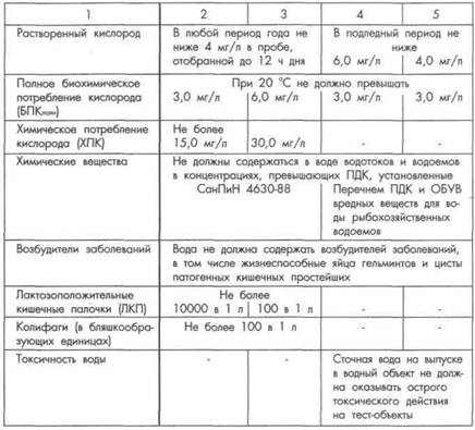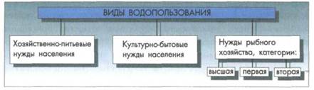 Требования потребителей к качеству воды зависят от целей использования. Выделяют три вида водопользования: хозяйственно-питьевое - использование водных объектов или их участков в качестве источника хозяйственно-питьевого водоснабжения, а также для водоснабжения предприятий пищевой промышленности; культурно-бытовое - использование водных объектов для купания, занятий спортом и отдыха. К этому виду водопользования относятся и участки водных объектов, находящиеся в черте населенных мест; водоемы рыбохозяйственного назначения, которые, в свою очередь, делятся на три категории: высшая категория - места расположения нерестилищ, массового нагула и зимовальных ям особо ценных и ценных видов рыб, других промысловых водных организмов, а также охранные зоны хозяйств для искусственного разведения и выращивания рыб, других водных животных и растений;