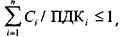 где С - концентрации отдельных веществ, нормируемых по одинаковому ЛПВ 1 -го и 2-го классов опасности; ПДК, - предельно допустимые концентрации /-того вещества соответственно, п - число суммируемых веществ.