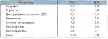 Допустимая концентрация вещества в почвенном слое (ПДКП) устанавливается с учетом его фоновой концентрации, стойкости и токсичности. ПДК устанавливается экспериментально в зависимости от допустимой остаточной концентрации (ДОК) в пищевых, кормовых растениях и в продуктах питания. ДОК - это максимальное количество вещества в продуктах питания, которое, поступая в организм в течение всей жизни, не вызывает никаких нарушений в здоровье людей. Для летучих веществ ПДКп устанавливают в зависимости от ПДК этого вещества в атмосферном воздухе, т. е. при поступлении этого вещества в воздух ПДКа.в. не должно быть превышено. Кроме того, учитывается поступление загрязняющих веществ из почвы в грунтовые воды, в которых не должны быть превышены ПДК веществ в водных объектах. С учетом всех этих признаков вредности в качестве ПДКП принимается наиболее жесткая концентрация. В почвах нормируется в основном содержание пестицидов (лат. pestis - зараза, caedo - убиваю) - ядохимикатов используемых для Глава 10. Основы права и нормирование качества окружающей природной среды борьбы с вредителями, сорняками, паразитами, грызунами: инскетицидов(лат. insectum - насекомые), фунгицидов(лат. fungus - гриб), гербицидов (лат. herba - трава), акарицидов(лат. akari - клещ) И др. Нормируется содержание и многих других химических веществ: тяжелых металлов, галогенов (хлор, бром), микроэлементов. При этом содержание нормируемых примесей зависит от вида сельскохозяйственной продукции (мясная, молочная, растительная). Перечень ПДКп для некоторых инсектицидов приведен в табл. 10.4. Таблица 10.4 ПДКП некоторых инсектицидов и допустимые остаточные концентрации этих веществ в продуктах питания (ДОК), мг/кг (по Г. В. Стадницкому, 1995)