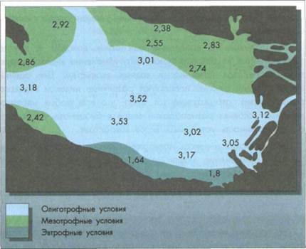 чины пробы и безразмерны. Ю. Л. Вилмом (1970) были подсчитаны индексы разнообразия (d) на 22 незагрязненных и 21 загрязненном участках разных рек США. На незагрязненных участках индекс колебался от 2,6 до 4,6, а на загрязненных -от 0,4 до 1,6. Авторы учебника использовали этот же индекс для оценки изменения структуры фитоценоза в различных по степени троф-ности районах Невской губы (рис. 11.4).