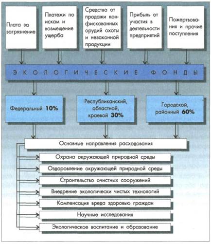 Рис. 11.8. Источники образования, распределение и направления расходования экологических фондов Экономическое стимулирование охраны окружающей природной среды в России осуществляется следующим образом: - установлением налоговых и иных льгот предприятиям при внедрении безотходных технологий, использовании вторичных ресурсов и осуществлении другой деятельности, обеспечивающей природоохранный эффект;
