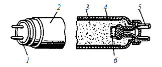Рис. 2.3. Внешний вид и разрез люминесцентной лампы: 1–цоколь; 2–колба; 3– ртутные пары; 4– слой люминофора; После откачки воздуха при изготовлении лампы внутрь колбы вводится капля ртути (20…30 мг), которая испаряется при работе лампы. Также вводится небольшое количество чистого газа – аргона, для уменьшения процесса испарения вольфрамовых электродов и ускорения зажигания лампы. Длина и диаметр стеклянной трубки определяются мощностью лампы и напряжением, на которое она рассчитана и выпускаются с диаметром 40, 26 и 16 мм. По форме различаются линейные, U-образные, кольцевые, а также компактные. Светоотдача люминесцентных ламп составляет примерно 40, 50, 60, 80 лм/Вт и более. Выпускаются люминесцентные лампы мощностью 20, 30, 40, 80 Вт с колбой диаметром 40 мм и улучшенной конструкции 18, 36, 58 Вт с колбой диаметром 26 мм. Маркировка люминесцентных ламп состоит из букв, обозначающих конструктивные признаки и цифр указывающих мощность ламп. Первая буква – тип лампы Л – люминесцентная, ТЛ – сигнальные, ЛЛ – тлеющего разряда, ГР – трубки для световой рекламы; вторая буква – цвет излучения Б- белый, ТБ – тепло-белый, ХБ – холодно-белый, Д – дневной, Е – естественно-белый, УФ – ультрафиолетовый, К – красный, С – синий, З – зеленый, Г – голубой; третья группа букв – одна или две буквы Ц – высокое или очень высокое качество цветопередачи; четвертый элемент – одна буква – особенности конструкции лампы: Р – рефлекторная, У – U-образная, К – кольцевая, Б – быстрого пуска, А – амальгамная; пятый элемент – группа цифр – мощность лампы в ваттах. Люминесцентные лампы включаются в электрическую сеть с помощью пускорегулирующей аппаратуры (ПРА), для зажигания и обеспечения нормального режима работы. Это усложняет конструкцию, а следовательно, стоимость осветительных приборов и некоторую сложность в эксплуатации, что безусловно является недостатками люминесцентных ламп. К недостаткам люминесцентных ламп можно отнести сложность утилизации из-за наличия в колбе ртути, ненадежная работа в температурных диапазонах до 15°С и выше 25°С, относительно низкая стабильность светового потока в течение срока службы. Кроме указанных недостатков люминесцентные лампы обладают рядом достоинств, к которым следует отнести: – линейный источник света, что позволяет создать более равномерное освещение и эстетическое оформление осветительной установки; – высокая световая отдача до 100 лм/Вт; – большой срок службы до 10000…12000 ч; – низкая яркость и температура поверхности колбы; – качественная цветопередача (у отдельных серий ламп); – относительно невысокая себестоимость изготовления. В зависимости от схемы включения ламп применяют ЭмПРА стартерные и бесстартерные. Стартерные ЭмПРА состоят из дросселя, стартера (зажигателя) и конденсаторов. Стартер служит для автоматического предварительного подогрева электродов и зажигания лампы. Представляет собой лампу тлеющего разряда, состоящую из стеклянного баллона 2, наполненного инертным газом – неоном (рис. 2.6, а). В стеклянном баллоне вмонтированы два электрода: один металлический, другой биметаллический. Между электродами имеется зазор 2…3 мм. Дроссель, представляет собой катушку индуктивности с сердечником из листовой электротехнической стали. Дроссель имеет индуктивность 4…5 Гн. Такая большая величина индуктивности, как прав