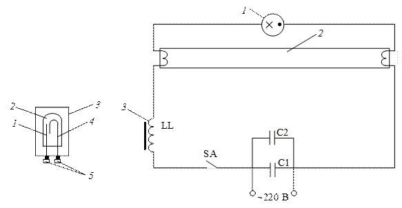 Рис. 2.4. Схема электрическая включения люминесцентной лампы в сеть: а– стартер (неоновая лампа тлеющего разряда): 1– металлический электрод; 2– стеклянный баллон; 3– защитная оболочка; Характеристики люминесцентных ламп Световой поток люминесцентных источников света зависит в основном от мощности ламп, спектр излучения – от состава люминофора. Например, лампы типа ЛД испускают 92 % потока в области 460…610 нм, лампы ЛБЦ – 94 % в области 510…660 нм. Пульсация светового потока обусловлена погасанием и перезажиганием лампы в каждый полупериод переменного тока. Освещение объектов пульсирующим световым потоком утомляет зрение, вызывает стробоскопический эффект (кажущаяся неподвижность объекта при совпадении частот пульсации светового потока и движущегося объекта). Пульсация светового потока характеризуется коэффициентом пульсации