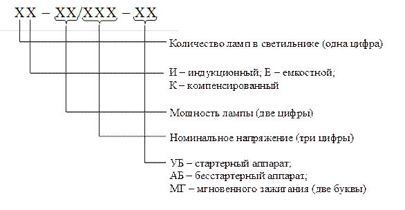 где Коэффициент пульсации определяется составом люминофора и схемой включения в сеть (составляет 25…40%). Световая отдача люминесцентных ламп составляет 60…80 лм/Вти зависит от свойств люминофора, соотношения длины и диаметра трубки лампы. Световая отдача снижается на 30…40 % к концу срока службы ламп. Это обусловлено необратимыми химическими реакциями люминофора с примесями в газах, износом электродов и другими факторами. Срок службы люминесцентных ламп зависит от стойкости электродов. Электротехническая промышленность выпускает люминесцентные лампы со сроком службы до 10…12 тысяч часов. Кроме стартерных схем зажигания люминесцентных ламп применяются бесстартерные схемы. Схемы бесстартерного зажигания подразделяются на трансформаторные, импульсные. Предприятия-изготовители для различных схем включения люминесцентных ламп (стартерных и бесстартерных) комплектуют отдельные элементы схем включения в блоки (ПРА). ПРА имеют маркировку состоящую из цифр и букв. Маркировка ПРА: