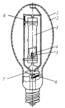Рис. 2.6. Лампа типа ДРЛ (в разрезе): 1– внешняя стеклянная колба; 2– слой люминофора; 3– разрядная трубка из прозрачного кварцевого стекла; 4– рабочий После зажигания дугового разряда происходит нагревание разрядной трубки и испарение ртути. Давление паров ртути повышается, вместе с тем изменяются все характеристики разряда: растут напряжение на лампе, Лампы типа ДРЛ (Д – дуговая, Р – ртутная, Л - люминесцентная). Они представляют собой ртутную горелку в виде трубки из прозрачного кварцевого стекла, смонтированную в колбе из тугоплавкого стекла. Внутренняя поверхность стеклянной колбы покрыта тонким слоем порошкообразного люминофора. В качестве люминофора применяют главным образом фосфат-ванадат иттрия, активированный европием. Колба лампы снабжена резьбовым цоколем. Лампы типа ДРЛ выпускаются с горелками, имеющими кроме двух основных электродов еще два зажигающих электрода, служащих для облегчения зажигания разряда. Лампы включаются в электрическую сеть через дроссель. Лампы ДРЛ характеризуется высокой светоотдачей и сроком службы в среднем 10000 ч. Световая отдача ламп ДРЛ составляет примерно для ДРЛ 250 - 54, ДРЛ400 – 60, ДРЛ700 – 58, ДРЛ1000 - 59 лм/Вт. Спектр видимого излучения смещен в сторону ультрафиолетового излучения и поэтому эти лампы непригодны для освещения тех помещений, где работа связана с высокими требованиями по цветопередаче. Металлогалогенные лампы Устройство и принцип действия металлогалогенных ламп основан на том, что галогениды многих металлов испаряются легче, чем сами металлы, и не разрушают кварцевое стекло. Поэтому внутрь колб металлогалогенных ламп кроме ртути и аргона дополнительно вводятся различные химические элементы в виде их галоидных соединений, например, йод, бром, хлор. После зажигания разряда, когда достигается рабочая температура колбы, галогениды металлов частично переходят в парообразное состояние. Попадая в центральную зону разряда с температурой несколько тысяч градусов Кельвина, молекулы галогенидов диссоциируют на галоген и металл. Атомы металла возбуждаются и излучают характерные для них спектры. Диффундируя за пределы разрядного канала и попадая в зону с более низкой температурой вблизи стенок колбы, они воссоединяются в галогениды, которые вновь испаряются. Такой замкнутый цикл обеспечивает некоторые преимущества перед лампами ДРЛ: во-первых в разряде создается концентрация атомов металлов, дающих требуемый спектр излучения, так как при рабочей температуре кварцевой колбы 800…900°С давление паров галогенидов многих металлов значительно выше, чем самих металлов, таких как таллий, индий, скандий, диспрозий и др. и во-вторых появляется возможность вводить в разряд щелочные металлы натрий, литий, цезий и другие агрессивные металы (например, кадмий, цинк), которые в чистом виде вызывают быстрое разрушение кварцевого стекла, а в виде галогенидов не вызывают такого разрушения. Для общего освещения в настоящее время наиболее широкое распространение получили металлогалогенные лампы со следующими составами металлогалогенных добавок (кроме ртути и зажигающего газа): 1) иодиды натрия, таллия и индия; 2) иодиды натрия, скандия и тория. Лампы имеютспектр, состоящий из отдельных линий ртути и линий добавок, расположенных в различных областях спектра, благодаря чему удается сочетать вы