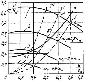 где Q — подача насоса, м3/с; Нг— геодезический напор, равный разности высот нагнетания и всасывания, м; Нс — суммарный напор, м; P2 — давление в резервуаре, куда перекачивается жидкость, Па; P1 — давление в резервуаре, откуда перекачивается жидкость, Па; ΔН — потеря напора в магистрали, м; зависит от сечения труб, качества их обработки, кривизны участков трубопровода и т. д.; значения ΔН приводятся в справочной литературе; ρ1 — плотность перекачиваемой жидкости, кг/м3; g = 9,81 м/с2 — ускорение свободного падения; ηн, ηп — к. п. д. насоса и передачи. С некоторым приближением для центробежных насосов можно принять, что между мощностью на валу и скоростью существует зависимость Р = сω3 и М = сω2. Практически показатели степени у скорости меняются в пределах 2,5— 6 для различных конструкций и условий работы насосов, что необходимо учитывать при выборе электропривода. Указанные отклонения определяются для насосов наличием напора магистрали. Отметим попутно, что очень важным обстоятельством при выборе электропривода насосов, работающих на магистрали с высоким напором, является то, что они весьма чувствительны к снижению скорости двигателя. Основной характеристикой насосов, вентиляторов и компрессоров является зависимость развиваемого напора Н от подачи этих механизмов Q. Указанные зависимости представляются обычно в виде графиков НQ для различных скоростей механизма. На рис. 1 в качестве примера приведены характеристики (1, 2, 3, 4) центробежного насоса при различных угловых скоростях его рабочего колеса. В тех же координатных осях нанесена характеристика магистрали 6, на которую работает насос. Характеристикой магистрали называется зависимость между подачей Q и напором, необходимым для подъема жидкости на высоту, преодоления избыточного давления на выходе из нагнетательного трубопровода и гидравлических сопротивлений. Точки пересечения характеристик 1,2,3 с характеристикой 6 определяют значения напора и производительности при работе насоса на определенную магистраль при различных скоростях.