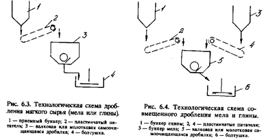 Отделение вторичного дробления с бункерами и питателями размещают в самостоятельном здании, соединенном с отделением первичного дробления галереей, в которой размещен ленточный транспортер 4. Вторичное дробление осуществляется в молотковой дробилке до крупности 0—25 мм. Дробленый в молотковой дробилке материал ленточным транспортером 7 подается на склад или в бункер мельницы. Для предотвращения запыления окружающей среды молотковые дробилки и места перегрузок материала необходимо оборудовать вентиляционной установкой и рукавными фильтрами для очистки запыленного воздуха.