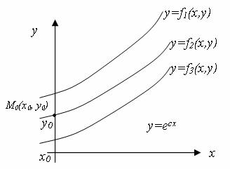 Рисунок 9.1. – Сімейство інтегральних кривих диференціального рівняння (9.1) Геометрично загальний розв’язок диференціального рівняння являє собою сімейство інтегральних кривих цього рівняння (рис. 9.1). Частинним розв'язком диференціального рівняння називається будь-який розв’язок, що може бути отриманий з загального при визначених числових значеннях довільних постійних (рис. 9.1). Довільні постійні, що вхідять в загальний розв’язок, визначаються з початкових або крайових умов. Задача з початковими умовами ставиться так: знайти розв’язок Такі умови називаються початковими умовами, а задача відшукання розв‘язку Задача з крайовими умовами ставиться так: знайти розв’язок Такі умови називаються крайовими умовами, а задача відшукання розв‘язку У випадку рівняння першого порядку, тобто при n =1, одержуємо задачу Коші для рівняння Геометрично задача Коші для рівняння першого порядку полягає в тому, що з усіх інтегральних кривих, що представляють собою загальний розв‘язок, потрібно знайти ту інтегральну криву, що проходить через точку М0 з координатами Часто в задачі Коші у ролі незалежної змінної виступає час t. Прикладом може бути задача про вільні коливання тіла, яке підвішене на пружині. Рухи такого тіла описуються диференційним рівнянням, в якому незалежною змінною є час t. Якщо додаткові умови задані у вигляді значень переміщень чи швидкості при t=0, то це також задача Коші. Задача Коші має єдиний розв‘язок, що задовольняє умові в