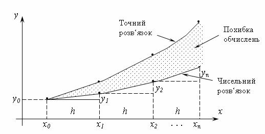 де N - постійна Ліпшица, що залежить від а і b (а і b - границі області). Методи точного інтегрування диференціальних рівнянь придатні лише для порівняно невеликої частини рівнянь, що зустрічаються на практиці. Тому в задачах моделювання та дослідження складних технічних систем, наприклад, систем автоматичного управління, великого значення набувають методи наближеного розв’язання диференційних рівнянь, що у залежності від форми представлення розв’язку можна розділити на дві групи: 1) аналітичні методи, що дають наближений розв’язок диференційного рівняння у виді аналітичного виразу; 2) чисельні методи, що дають наближений розв’язок у вигляді таблиці. Похибки. Перед тим, як перейти до розглядання методів чисельного розв'язання диференційних рівнянь, зупинимося на джерелах похибок, пов'язаних з чисельною апроксимацією. Таких джерел три: 1. Похибка округлення зумовлена обмеженнями на представлення чисел в ЕОМ, тому що число значущих цифр, що запам'ятовується і використовується в обчисленнях, обмежене. 2. Похибка відсічення зв'язана з тим, що для апроксимації функції замість