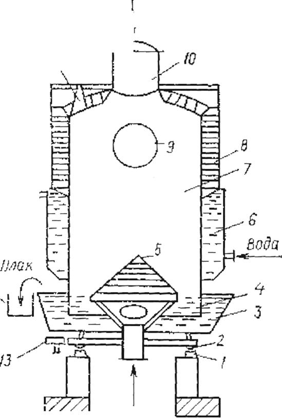 Рис 1. Газогенератор с вращающейся колосниковой решеткой: 1 – рельсовая опора, 2 – каток, 3 – чаша; 4 – «фартук», 5 – колосниковая решетка;6 – водяная рубашка, 7 – шахта, 8 – футеровка, 9 – газослив, 10 –загрузочное устройство, 11 – шуровочное отверстие; 12 – шлакоприемник, 13 – привод