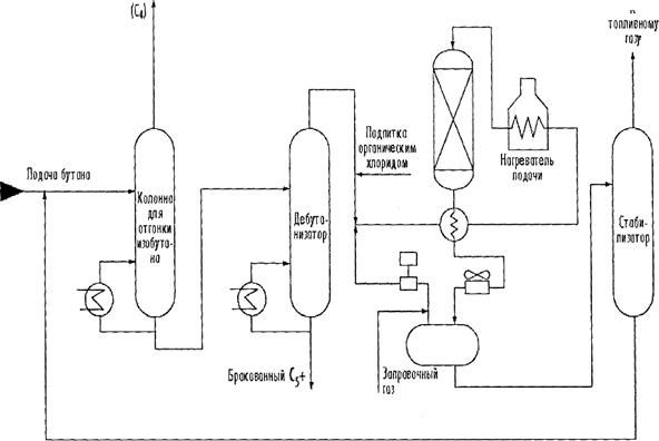 Изомеризация бутана производит исходное сырье для алкилирования. Низкотемпературный процесс использует высокоактивный хлорид алюминия или хлористоводородный катализатор без нагревателей с целью изомеризации н-бутана. Обработанное и предварительно нагретое исходное сырье добавляется к оборотному потоку, смешивается с НСl и пропускается через реактор (рис. 13). Изомеризация пентана/гексана используется для увеличения октанового числа путем преобразования н-пентана и н-гексана. В типичном процессе изомеризации пентана/гексана осушенное и десульфурированное исходное сырье смешивается с небольшим количеством органического хлорида и оборотным водородом и нагревается до температуры реактора. Затем оно проходит через катализатор, поддерживаемый металлом, в первый реактор, где бензол и олефины подвергаются гидрированию. Затем оно подается к реактору изомеризации, где парафины преобразуются в изопарафины путем каталитической изомеризации, охлаждаются и подаются к сепаратору. Газ и водород в сепараторе отделяется и рециркулирует с подпитывающим водородом. Жидкость нейтрализуется щелочами и подается в колонну отпаривания, где хлористый водород восстанавливается и рециркулирует.