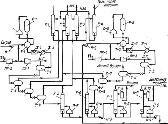 Р-1, 2 – реакторы гидрокрекинга; П-1, 2 – трубчатые печи; К-1, 2, 3 – колонны очистки газа от сероводорода; К-4 – колонна отпаривания сероводорода из отработанного раствора МЭА; К-5, 6 – стабилизационные колонны; К-7, 9 – ректификационные колонны; К-8, 10 – отпарные секции; С-1-8 – сепараторы; П-3-6 – огневые рибойлеры; Т-1, 2 – теплообменники; Х-1-3 – воздушные конденсаторы-холодильники; Х-2-4 – водяные холодильники; ПК-1, 3 – компрессоры циркуляционного газа; ПК-2, 4 – компрессоры свежего водорода; Н-1-4 – насосы; Ц. г – циркулирующий газ