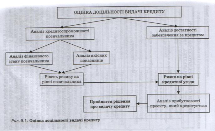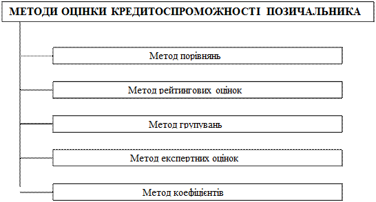 Кредитоспроможність (платоспроможність) — це "здатність позичальника повністю та у визначений строк розрахуватися за своїми борговими зобов'язаннями. Головна мета оцінки кредитоспроможності позичальника — оцінка кредитного ризику та виявлення джерел погашення позичальником відсотків і заборгованості за кредитом. Оцінка кредитоспроможності позичальника може проводитись за допомогою різних методів за вибором банку (рис. 9.2).