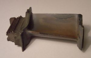 Рабочая лопатка ротора турбины двигателя RB199, из литейного никелевого жаропрочного сплава, бывшая в эксплуатации. В 1950-х годах компаниями Pratt & Whitney и General Electric были разработаны сплавы Уаспалой (Waspaloy) и M-252, легированные молибденом и предназначенные для лопаток авиационных двигателей. Затем были разработаны такие сплавы, как Hastelloy alloy X, Rene 41, Инконель, в том числе Inco 718, Incoloy 901 и др. Согласно оценкам экспертов, за период 1950-1980-х годов химические составы никелевых жаропрочных сплавов изменялись наиболее значительно за счет введения алюминия и замещающих его элементов в Жаропрочные сплавы на основе никеля, как правило, обладают сложным химсоставом. Он включает 12 — 13 компонентов, тщательно сбалансированных для получения необходимых свойств. Содержание таких примесей, как кремний (Si), фосфор (P), сера (S), кислород (O) и азот (N) также контролируется. Содержание таких элементов, как селен (Se), теллур (Te), свинец (Pb) и висмут (Bi) должно быть ничтожно малым, что обеспечивается подбором шихтовых материалов с низким содержанием этих элементов, т.к. избавиться от них в ходе плавки не представляется возможным. Эти сплавы обычно содержат 10—12 % хрома (Cr), до 8 % алюминия (Al) и титана (Ti), 5-10 % кобальта (Co), а также небольшие количества бора (B), циркония (Zr) и углерода (C). Иногда добавляются молибден (Mo), вольфрам (W), ниобий (Nb), тантал (Ta) и гафний (Hf). Легирующие элементы в этих сплавах можно сгруппировать следующим образом: