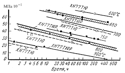 Рис. 12.2. Длительная прочность сплавов ХН77ТЮ и ХН77ТЮР Для длительных сроков службы наилучшее сочетание длительной прочности и пластичности у сплава ХН65ВМТЮ, получившего широкое применение как материал для лопаточного аппарата стационарных газовых турбин ГТ-6, ГТН-9, ГТК-10, ГТК-16, ГТТ-12, ГТА-18, ГТУ-25, ГТУ-100. Этот сплав — основной лопаточный материал в стационарном газотурбостроении. Кроме того, благодаря исключительно высокой релаксационной стойкости этот сплав применяют для изготовления крепежных деталей турбин. Из жаропрочных никелевых сплавов можно получать детали методом отливки (например, точным литьем по выплавляемым моделям). Ко второй группе относятся сплавы марок ХН70, ХН60Ю, ХН70Ю, ХН78Т, ХН60В, ХН75МБТЮ, применяемые преимущественно как жаростойкие. Эти сплавы, за исключением двух последних, отличаются высоким содержанием Cr (20–30 %) и практически гомогенной структурой твердого раствора после принятых режимов термической обработки (нагрев до 1000–1200 °С с охлаждением в воде или на воздухе). Эти сплавы выпускают в виде холоднокатаного или горячекатаного листа преимущественно для деталей газопроводных систем, работающих при умеренных напряжениях в условиях весьма высоких температур (до 1100–1200 °С). У этих деталей кроме достаточной технологичности (прокатываемость, штампуемость, свариваемость) и высокого сопротивления газовой коррозии (окалиностойкость) должно быть хорошее сопротивление термической усталости (термостойкость). Всем этим требованиям отвечают сплавы на никелевой основе. У жаростойких листовых никелевых сплавов повышена пластичность в холодном и горячем состоянии, но жаропрочность ниже, чем у сплавов первой группы. Так, длительная прочность за 1000 ч составляет 40–60 МПа при 800 °С и 20–25 МПа при 900 °С (табл. 12.7). Химический состав жаропрочных и жаростойких сталей и сплавов на никелевой основе приведен в табл. 12.11. Физические свойства в зависимости от температуры (коэффициент линейного расширения, модуль нормальной упругости, плотность, теплопроводность, удельная теплоемкость) для коррозионностойких сталей и сплавов приведены в табл. 12.12–12.16.