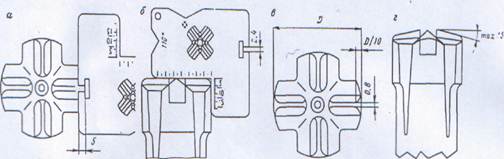 Рис. 2.4 схема заточки крестовых коронок: а - замер допустимого износа, б - замер высоты обратного конуса, в -схема заточки, г - угол износа лезвия коронки