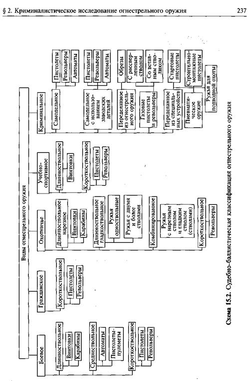 Ручное огнестрельное оружие имеет достаточно простую и приемлемую для криминалистической практики классификацию. В соответствии с ней оружие подразделяется на боевое, гражданское, охотничье, учебно-спортивное, криминальное (схема 15.2). Боевое оружие представляет собой оружие заводского изготовления, одноствольное, многозарядное, с нарезным стволом и, как правило, скользящим затвором, предназначенное для стрельбы пулями. Короткоствольное оружие имеет длину ствола до 20 см. К нему относятся полуавтоматические пистолеты и револьверы. К среднествольному оружию (длина ствола 20— 50 см) — пистолеты-пулеметы, автоматы и карабины. Длинноствольные (длина ствола более 50 см) — это винтовки (карабины) и ручные пулеметы. Важным свойством боевого оружия является наличие нарезов в канале ствола. Оно имеет для судебной баллистики первостепенное значение как с точки зрения дальности и пробивного действия снаряда, так и для отождествления оружия по выстреленным пулям. Для характеристики оружия важен его калибр — диаметр канала ствола. В нарезном оружии калибр определяется расстоянием между противоположными полями нарезов (рис. 15.1). Обозначение калибра нарезного