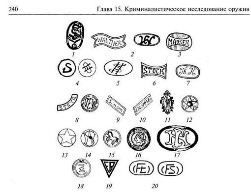 Рис. 15.2. Фирменные знаки на щечках рукояток некоторых автоматических пистолетов и револьверов (иногда аналогичные знаки штампуются и на металлических деталях оружия): 1 — «Зауер», 2 — «Вальтер», 3 — «Маузер», 4 — «Ортгиз», 5 — «Шмайсер», 6 — «Шток», 7— «Коммер», 8— «Штейер», 9 — «Симсон», 10— «Лиг-нозе», 11 — «Дрейзе», 12 — «ТТ» («Тула—Токарев»), 13 — «Макарова», 14 — «Смит-Вессон», 15 — «Кольт», 16 - «Севэдж», 17 — «Браунинг», 18 — «Чешски-Сброев-ка», 19 — «Польский Кольт-Радом», 20 — «Фромер» ношению к трупу, куда обращен ствол, на какой стороне (боку) лежит оружие, каково расстояние от него до обеих ладоней трупа. Изымают оружие с известными предосторожностями, имея в виду, что оно может быть заряжено. В первую очередь оружие разряжают, после чего приступают к осмотру. Осматривая оружие, обращают внимание на то, нет ли на его поверхности отпечатков пальцев, частиц крови, грязи и т. п. Затем подробно отмечают все его признаки, наличие маркировочных обозначений, дефектов и т. д. Особое внимание обращают на состояние оружия, в том числе его ударно-спускового механизма, наличие патрона в патроннике и патронов в магазине (барабане), наличие в стволе порохового нагара и несгоревших порошинок, запаха сгоревшего пороха в канале ствола. После осмотра оружия его упаковывают и направляют на экспертное исследование. Криминалистическое исследование позволяет установить прежде всего сам факт принадлежности объекта к категории огнестрельного оружия. Необходимость решения такого вопроса определяется тем, что могут быть объекты, являющиеся огнестрельным оружием, но внешне непохожие на его образцы (стреляющие трубки, «авторучки» и т. п.) либо обладающие всеми внешними признаками оружия, но не являющиеся таковыми (игрушки, муляжи и пр.).