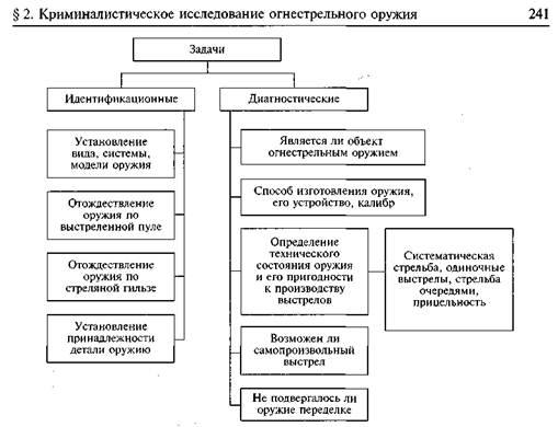 Схема 15.3. Основные задачи, решаемые при исследовании ручного огнестрельного оружия Немаловажным является установление, к какому виду (типу, системе, модели, образцу) относится данное оружие и какова его баллистическая характеристика. Уточняющими при этом являются вопросы о том, на какую предельную дистанцию возможны выстрелы из данного оружия и возможна ли прицельная стрельба из него на определенную дистанцию. Исследование оружия позволяет установить факт производства из него выстрела, в частности после чистки оружия. Весьма распространенными являются исследования оружия на предмет его исправности и пригодности к производству выстрелов. Решение каждого из этих вопросов имеет самостоятельное значение. Оружие может быть неисправным, но пригодным к стрельбе, поэтому ставить на разрешение экспертизы вопрос только об исправности оружия было бы неверным. Определяя исправность оружия, выясняют, возможна ли из него систематическая стрельба или только одиночные выстрелы. Если экспертизой будет установлена неисправность оружия, то требуется решить, насколько легко она устранима. Преступники нередко извлекают какую-либо часть ударно-спускового механизма оружия (обычно ударник) и хранят ее отдельно, чтобы в случае обнаружения сослаться на его принципиальную непригодность. Установление причин неисправности оружия важно и для тех криминальных случаев, когда необходимо выявить возможность так называемых самопроизвольных выстрелов. Их не следует путать с выстрелами случайными, когда, помимо воли стреляющего, происходит нажатие на спуско- Глава 15. Криминалистическое исследование оружия вой крючок или стрелявший нажимает на спуск, думая, что ружье не заряжено. Изучение обстоятельств самопроизвольного выстрела позволяет установить, в частности, не явились ли его причиной производственные дефекты, износ отдельных частей и т. п. При разрушении оружия (например, разрыв ствола) важно установить причину (производственный дефект, применение ненадлежащих боеприпасов и т. д.). Если оружие является самодельным, то причиной поломки могут быть недостатки конструкции. При исследовании оружия иногда приходится выяснять, являются ли обозначения на нем, главным образом его номер, подлинными; не перебит ли номер; нет ли на оружии спиленного (забитого, зашлифованного) номера или клейма; как первоначально читать номер оружия или каков был фирменный знак (клеймо) (схема 15.3).