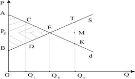 Напомним, что излишек потребителей характеризует чистую совокупную выгоду, получаемую ими от приобретения данного блага по установившейся на рынке равновесной цене. Она представляет собой сумму разностей между максимально высокой ценой /ценой спроса/, которую потребитель готов заплатить за конкретную единицу блага и той фактической ценой, которая сложилась на рынке, для всех единиц приобретаемой продукции. Излишек потребителей можно представить с помощью кривой спроса как часть плоскости, ограниченную осью цен, самой кривой спроса и линией равновесной цены. Упрощая реальность и рассматривая линейную функцию спроса, это соответствует на рисунке 4.19 площади треугольника АРЕЕ. Излишек производителей отражает чистую совокупную выгоду, получаемую последними от реализации данного блага по сложившейся на рынке равновесной цене. Она свидетельствует о прибыльности производства для тех производителей, чьи издержки производства на единицу продукции ниже рыночной цены и может быть рассчитана как сумма разностей между фактически сложившейся на рынке ценой и той минимально низкой ценой /ценой предложения/, которая позволяет производителю предлагать данную единицу продукции на рынке, для всех единиц реализуемой продукции. Полагая, что функция предложения имеет также как и функция спроса линейный вид, графически излишек производителей соответствует на рисунке 4.19 части плоскости, ограниченной осью цен, кривой предложения и линией равновесное цены, то есть площади треугольника ВРЕЕ. Совокупность излишков потребителей и производителей представляет собой общественную выгоду в целом /площадь треугольника АВЕ на рис.4.19/. Данная выгода максимальна тогда, когда конкурентный рынок находится в состоянии равновесия. Для того, чтобы понять это, рассмотрим объем выпуска Q1. Очевидно, что при данном объеме выпуска цена спроса превышает цену предложения. Это является свидетельством того, что потребительская оценка предельной полезности последней единицы продукции превышает оценку производителей в виде предельных издержек на ее получение. Следовательно, благосостояние рассматриваемых экономических субъектов может быть улучшено путем наращивания объема производства в силу заинтересованности в этом обеих сторон. Предположим, что в результате увеличения производства получено Q2 единиц продукции. Если исходить из сохранении прежней равновесной цены РЕ, то неизбежно ухудшение благосостояния как потребителей /площадь треугольника ЕМК/, так и производителей /площадь треугольника ЕТМ/. Таким образом, совокупные потери агентов экономики представимы площадью треугольника ЕТК. При наличии самостоятельности в принятии решений никто из них не проявит заинтересованности в расширении объема выпуска и реализации продукции, так как это порождает общественный ущерб от превышения объема рыночного производства над равновесным. Представленное объяснение позволяет сделать вывод о том, что только состояние рыночного равновесия позволяет максимизировать общественную выгоду в целом, так как обеспечивает получение максимально возможных излишков как производителями, так и потребителями. Отклонение от данного состояния не способно обеспечить рост благосостояния какого-либо субъекта без ухудшения благосостояния другого субъекта. Сделан