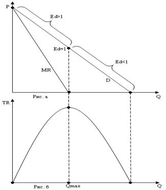 Поскольку кривая спроса имеет отрицательный наклон, то, следовательно, предельная выручка всегда будет меньше цены товара. Таким образом, при увеличении объема продаж монополист получает от каждой новой проданной единицы все меньшую добавочную выручку. При какой-то цене дальнейшее увеличение объема продаж еще на одну единицу товара уже не дает дополнительной выручки, а дальнейшее снижение цены приводит к тому, что предельная выручка становится отрицательной. Если функция спроса представлена линейной зависимостью, то функция предельной выручки монополиста будет убывать в два раза с большей скоростью. На рис. 5.1а график МR пересекает ось абсцисс в точке Qmax. При объеме выпуска Qmax общая выручка будет максимальной (рис.5.1в ). Общая выручка монополиста достигает своего максимального значения, когда МR=0. Взаимосвязь между предельной выручкой и эластичностью спроса по цене можно представить следующим образом. Поскольку ценовая эластичность спроса характеризуется соотношением между относительными изменениями спроса и цены: