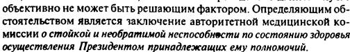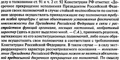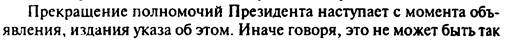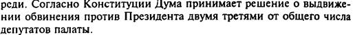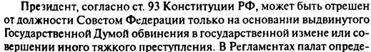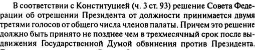 1. выдвижение ГД обвинения против Президента РФ – обвинение выдвигается ГД большинством в 2/3 голосов по инициативе не менее 1/3 депутатов и при наличии заключения специально образованной ГД комиссии; президент обвиняется в совершении гос.измены или иного тяжкого преступления. 2. заключения ВС РФ и КС РФ – ВС РФ дает заключение о наличии в действиях Президента признаков преступления, а КС РФ – о соблюдении порядка выдвижения обвинения. 3. отрешение Президента от должности Советом Федерации – СФ принимает решение об отрешении Президента от должности квалифицированным большинством голосов – 2/3 от общего состава в 3-месячный срок после выдвижения ГД обвинения. Импичмент считается отклоненным, если: решение не принято в 3-месячный срок, за отрешение проголосовали менее 2/3 членов СФ В случае импичмента Президент РФ прекращает полномочия с момента принятия СФ соответствующего решения.В случае досрочного прекращения Президентом полномочий по любому основанию исполнение его обязанностей возлагается на Председателя Правительства. Исполняющий обязанности Президента не имеет право роспуска ГД. Выборы нового Президента проводятся в 3-месячный срок.