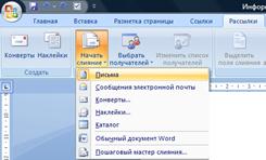 Рис.42. Окно вкладки Рассылки и панель задач Слияние. Ø создать основной документ письма (1 этап слияния) во вкладке Рассылки ленты инструментов в разделе «Начать слияние» выбрать команду «Начать слияние»; в открывшейся палитре выбрать Письма и щелкнуть в нижней части панели по ссылке «Далее. Открытие документа»; на странице Выбор документа выбрать одно из двух действий: создать новый документ или использовать уже существующий документ Если нужный документ отображен на экране, установить переключатель Текущий документ. Чтобы создать новый документ на основе шаблона, установить переключатель Шаблон. В разделе Шаблон щелкнуть по ссылке Выбор шаблона. В диалоговом окне Выбор шаблона найти нужный шаблон, выделить его и щелкнуть по кнопке ОК. Для поиска ранее созданного документа установить переключатель Существующий документ. Затем щелкнуть по кнопке Открыть. Выбрать нужный файл в диалоговом окне Открытие документа и щелкнуть по кнопке Открыть. Рассылки®Начать слияние®Письма® Далее. Открытие документа®Выбор документа®…