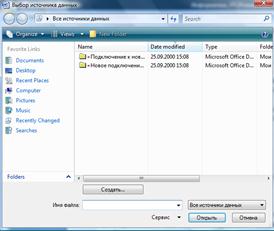 Рис. 46. Окно «Выбор источника данных» операционной системы. Ø редактировать записи в источнике данных на вкладке Рассылки выбрать команду Изменить список получателей; в списке Источник данных выбрать нужный источник и щелкнуть по кнопке Изменить элемент Рассылки®Изменить список получателей® Источник данных®Изменить элемент®… Ø создать письмо (4 этап) поместить курсор в то место основного документа, куда необходимо добавить поле слияния, и щелкнуть по ссылке, соответствующей типу этого поля слияния (блок адреса, строка приветствия, почтовая марка, другие элементы); в появившемся окне задать параметры (объекты) поля слияния и подтвердить вставку, нажав на кнопку ОК; щелкнуть на ссылку Далее. Просмотр писем