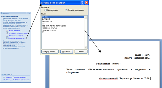 Рис. 47. Опции панели «Создание письма» панели «Слияние» и документ с вставленными полями слияния. Ø вставить в основной документ поле слияния в вкладке Рассылка в разделе Составление документа выбрать команду Вставить поле слияния; в появившемся меню выбрать вставляемое поле; задать его параметры в появившемся окне инажать на кнопку ОК Рассылки®Изменить список получателей® Источник данных®Изменить элемент®…