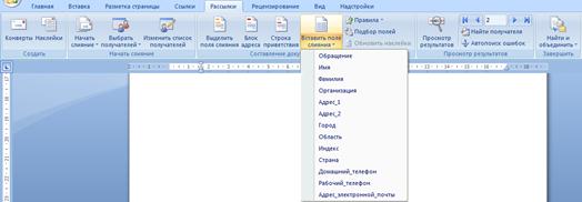 Рис. 48. Добавление полей слияния в документ. Ø задать параметры блока адреса в диалоговом окне Вставка блока адреса снять (установить) флажок для данных, которые не должны (должны) быть включены в адресный блок это поле; подтвердить выбор, нажав на кнопку ОК