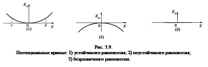 Положение D соответствует абсолютному минимуму энергии – это положение стабильного равновесия. Если шар в состоянии C (рис. 3.8) приобретет энергию (над ним совершат работу внешние силы) A = WпB – WпС., то он перейдет в состояние D – стабильного равновесия. Поэтому состояние системы в положении С называют метастабильным равновесием. Энергия системы в положении А (рис. 3.8) при бесконечно малом отклонении шара от своего положения не меняется – это положение безразличного равновесия. Связь потенциальной энергии с потенциальными силами позволяет задавать воздействие потенциальных сил на тело зависимостью потенциальной энергии от координат, например для одномерного случая Е n = f (x). Кривые, соответствующие этой зависимости называются потенциальными кривыми (рис.3.9).